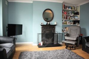 Living room: 4.83m x 3.88m. Semi solid wood flooring, open fire with iron cast fire surround, fixed shelving unit, bay window, curtains.