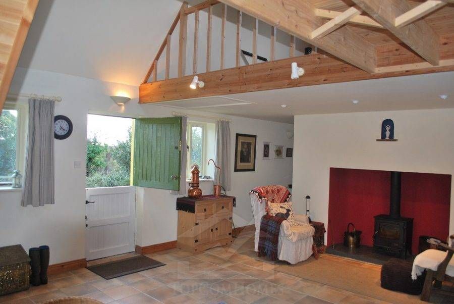 The artist’s cottage has a large, bright living room with underfloor heating and a wood-burning stove, a half-door to the front and a set of glazed doors to the rear. There is a small kitchen and a shower room; upstairs is a private bedroom area and mezzanined workspace.